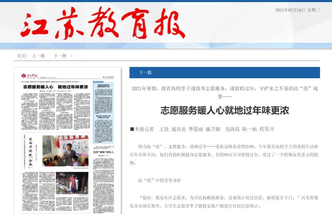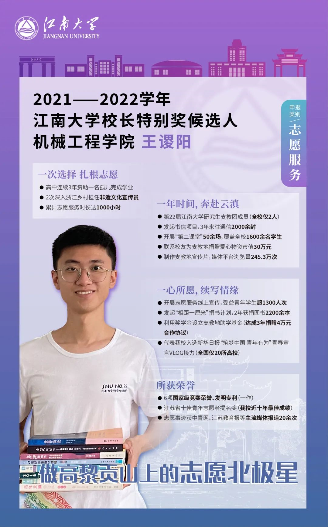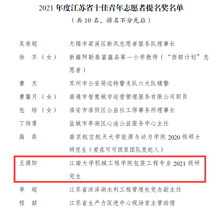 他就是机械工程学院包装工程专业2021级硕士研究生 王谡阳, 曾被中青网、江苏教育报等媒体报道20余次,并获评江苏省十佳青年志愿者提名奖、江南大学“校长特别奖”等荣誉。
