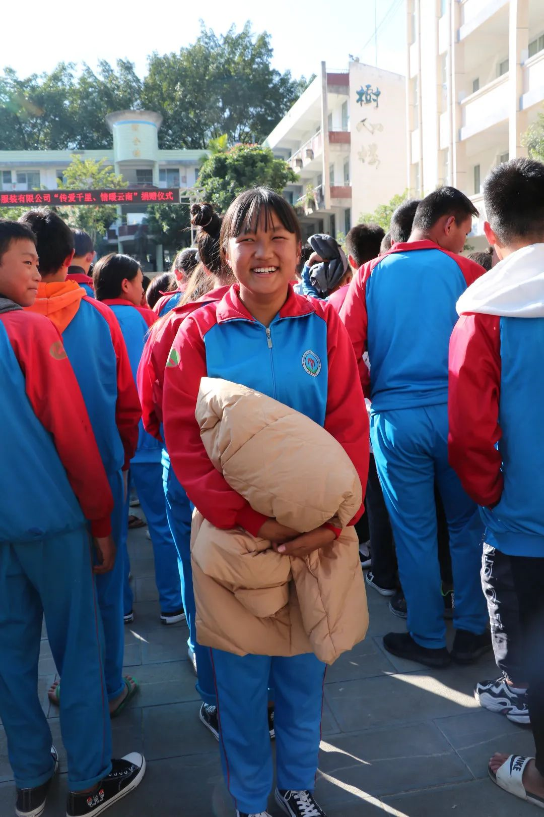 念念不忘,必有回响。越来越多的爱心人士纷纷与他取得联系。通过开展“相距一厘米”捐书计划,获捐爱心图书2200本,并在高中部各班设立“树人书屋”图书角;发起“传爱千里,情暖云南”爱心衣物捐赠活动,获捐暖冬衣物410件,累计市值11万余元;联合旺旺集团为在校师生捐赠冬日暖心新年礼包700份,累计价值18万余元。