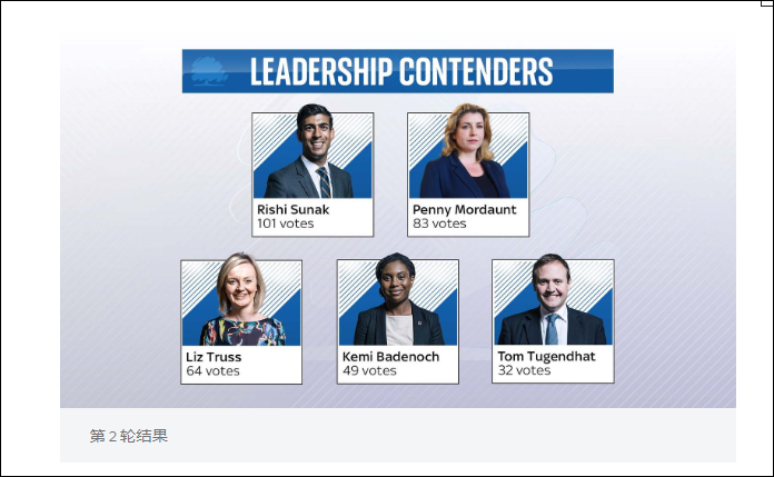目前来看,苏纳克一路领先,优势明显,莫当特和特拉斯紧随其后,三人成为最有希望的候选人。