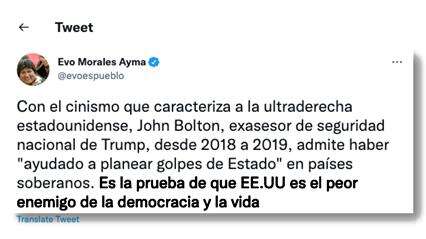 玻利维亚前总统埃沃·莫拉莱斯直呼“美国是民主和生命的最大敌人”。