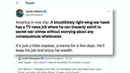 “一个嗜血的右翼战争鹰派竟在电视新闻节目上厚颜无耻地承认秘密的战争罪行,而不用担心任何后果……”