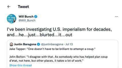 《费城询问报》记者威尔·邦奇无奈地表示“我对美国的帝国主义行径调查了整整几十年,没想到他就这么直接说出来了……”