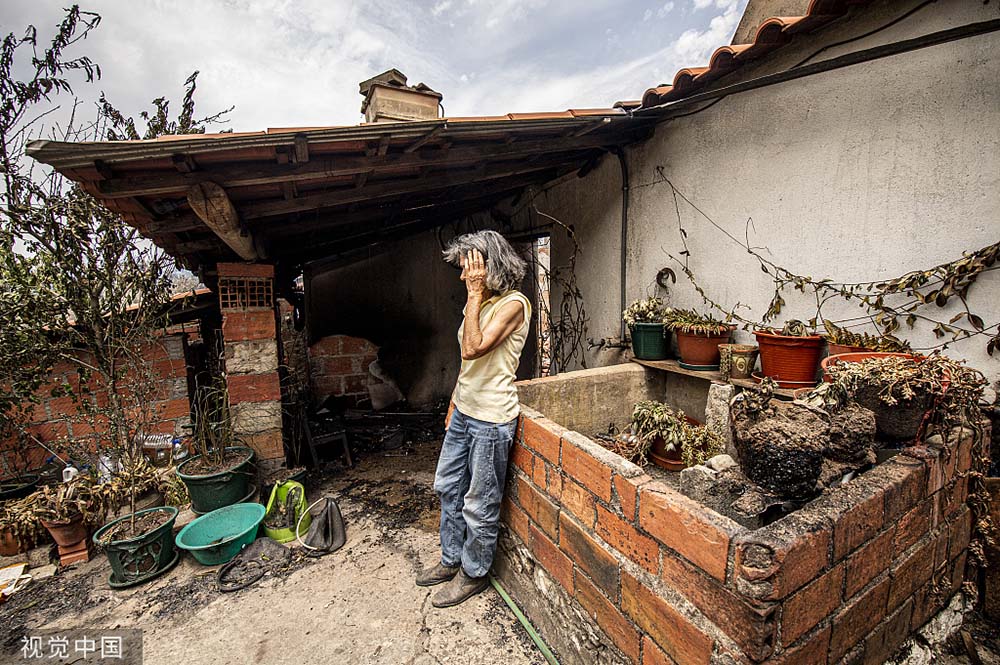 当地时间2022年7月14日,葡萄牙阿尔瓦亚泽雷的Outeiro da Serra,一位妇女在她被烧毁的住所前。由于高温天气的持续影响,葡萄牙大部分地区的火灾警报并未得到缓解,预计该国天气短期内难以出现好转。人民视觉 图