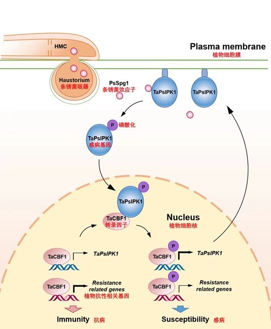 小麦条锈病因条锈菌而发病传播。条锈菌是一种活体营养寄生的真菌,须依赖活体小麦才能生存。植物免疫团队聚焦小麦条锈菌活体营养寄生特性,挖掘出全球首个被病菌毒性蛋白利用的小麦感病基因TaPsIPK1——编码胞质类受体蛋白激酶。感病基因负调控小麦的基础免疫,能够被条锈菌分泌的毒性蛋白PsSpg1劫持,从细胞质膜释放进入细胞核,在细胞核操纵转录因子TaCBF1,抑制抗性相关基因的转录,增强TaPsIPK1的转录水平,放大TaPsIPK1介导的感病效应,促进小麦感病。成果系统揭示了PsSpg1-TaPsIPK1-TaCBF1d的磷酸化与转录调控级联途径介导的感病机制。并利用基因编辑技术精准敲除感病基因,破坏了毒性蛋白和感病基因的识别和互作,实现了小麦对条锈病的广谱抗性。在大田试验中,小麦编辑品系在保持作物主要性状品质的前提下,展现出了高抗条锈病的特点,具有很好的应用潜力。