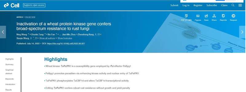 7月14日晚间,国际顶级期刊Cell(《细胞》)在线刊发西北农林科技大学植物免疫团队历经18年的研究成果——发现了小麦中协助条锈菌感染的“真凶”感病基因,并通过敲除感病基因,使得小麦不易遭受条锈菌的侵染,开辟了抗病小麦育种的新思路和新途径。