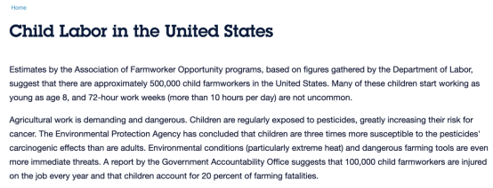 “美国农场工人就业培训计划”组织在2019年发布的一篇名为《田地里的儿童—你应该知道的故事》的小册子中分享了实地走访的一些农场童工的故事。比如, 7岁的伊克尔从5岁就开始工作,他唯一的期望就是厕所能够离他工作的地方近一点。16岁的贾拉克西靠收洋葱来帮父母买汽油和支付其他账单。与孩子们学习技能并获得良好的职业道德的乐观理想相去甚远,伊克尔、贾拉克西和其他许多拼命工作的孩子们一样,他们只是为了让家庭摆脱贫困。