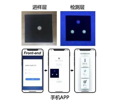 进样层滴加待测液,经过设计的微通道分别流入检测层,通过与预先固定的荧光探针结合,荧光信号在右上图中显示,手机App将拍照图片导入后,经计算显示出最终待测液浓度。