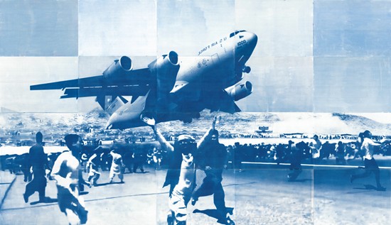 该作品的灵感源于2021年8月16日在阿富汗首都喀布尔机场美军撤离这一新闻事件,作者收集了当时现场的三四段视频和照片,从中截取具有不同解读空间的瞬间进行重组、编排、拼贴,再将组合成的新图像拆解成多个小块进行蓝晒制作。作品最终由20张图像拼合而成,试图重塑这一事件的全貌,并引发观者对媒介和历史的思考。