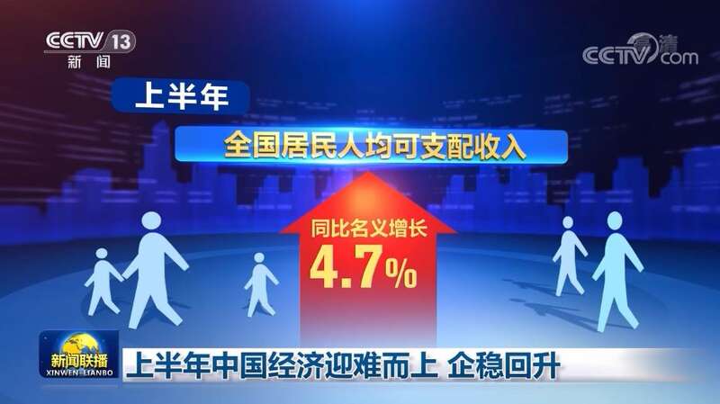 从民生指标看,物价总体平稳,就业形势好转,居民收入稳定增长。上半年,全国城镇新增就业654万人,完成年度目标任务的59%。全国居民人均可支配收入同比名义增长4.7%。