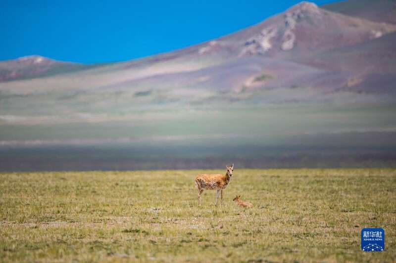 在羌塘国家级自然保护区,一只母藏羚羊在看护其幼崽(7月11日摄)。