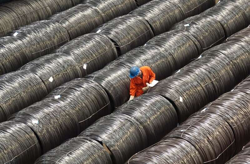 在辽宁省大连市东北特钢集团车间内,工作人员在核对产品(2017年5月15日摄)。新华社发(刘德斌 摄)
