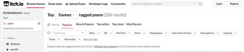 如对游戏选择表现的文学类型进行粗略的搜索与统计,会看到多数游戏制作者(尤其是个人)都选择用游戏来表现小说,其次则是诗歌。用游戏表现一部小说作品是常见的,相较之下,单纯表现诗则更为引人注目。在致力于分享个人独立制作游戏的“itch.io”平台上,如以“poem”作为关键词进行搜索,可以看到206款以“poem”作为“标签”的游戏。而诸如“drama”“prose”之类的字眼却没有独立的游戏标签,以此作为命名或说明的游戏也仅有几十款[1]。