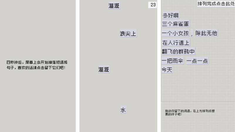 除此之外,限时的掉落与步数的限制也将使得玩家对呈现出的词语内容更加敏感。在“灵感”模式下,玩家需要专注于屏幕的显示,确定词语的内容并快速做出判断;“朝花夕拾”模式虽然没有限时,但是步数的限制也迫使玩家需要更加用心甚至谨慎地体味每一个词语的含义,并判断它们所能造就的可能。这两种模式都让玩家在有限的时间与选择内或主动或被动地加深着对词语乃至诗歌整体结构的感知。