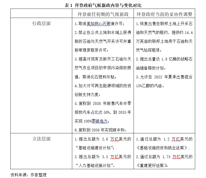 2022年初爆发的俄乌冲突以及高企的美元通胀压力使得拜登政府的气候新政面临新的内外环境挑战。拜登政府启动大量政府石油补助和对化石能源企业的政策支持,并在4月中旬宣布放弃其上任伊始发布的租赁禁令,恢复出售在联邦土地上钻探石油和天然气的租约。这一政策很大程度上意味着拜登气候新政陷入发展危机。通过对比发现拜登上任初期和当前鉴于俄乌冲突影响下的妥协性调整,其气候新政内容发生了较大变化。具体可见表1。