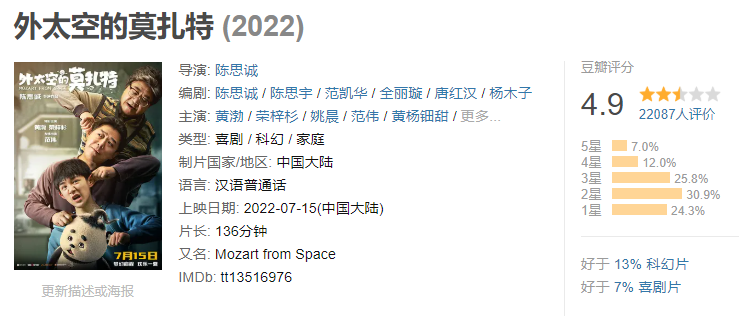 《外太空的莫扎特》豆瓣评分已跌至4-5分区间