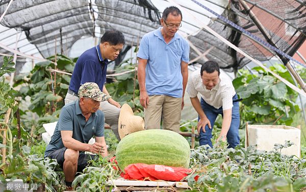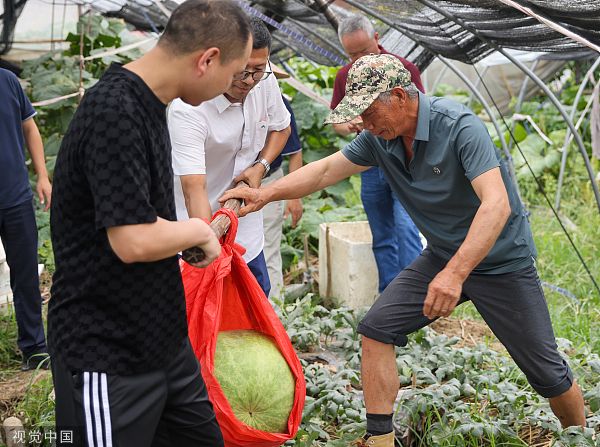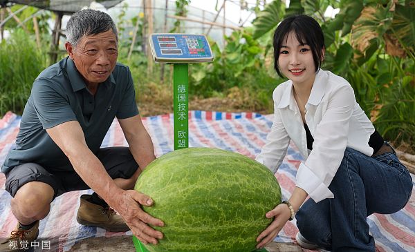 2022年7月18日,杭州,富阳场口镇,瓜农滕雁鸣种出了浙江最大的西瓜,重达32.1公斤。据悉,滕雁鸣曾经在2020年时候种出220公斤冬瓜,入选吉尼斯世界纪录。