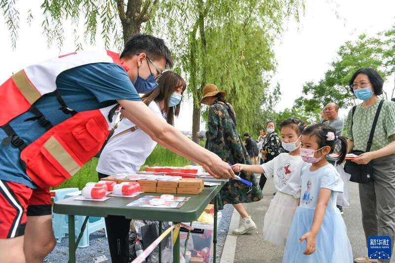 7月19日,内蒙古自治区红十字会志愿者在活动现场发放防溺水科普宣传品。
