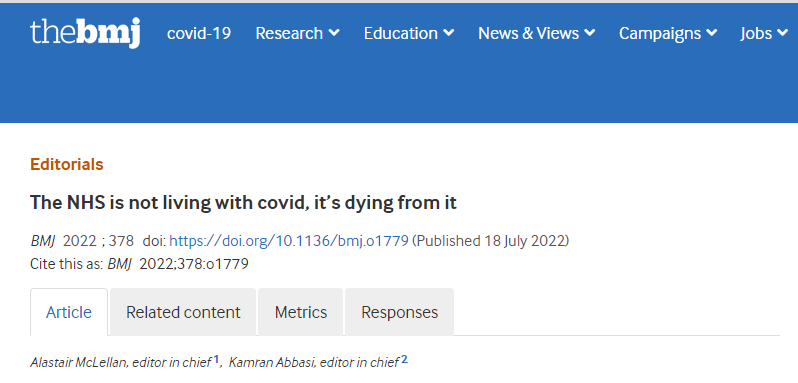 和柳叶刀齐名的顶级医学期刊《英国医学杂志》(BMJ)的主编阿拉斯泰尔·麦克莱伦(Kamran Abbasi)和《卫生服务杂志》(HSJ)的主编卡姆兰·阿巴西在BMJ官方网站上刊发联合社论,阐述了NHS遇到的困境。