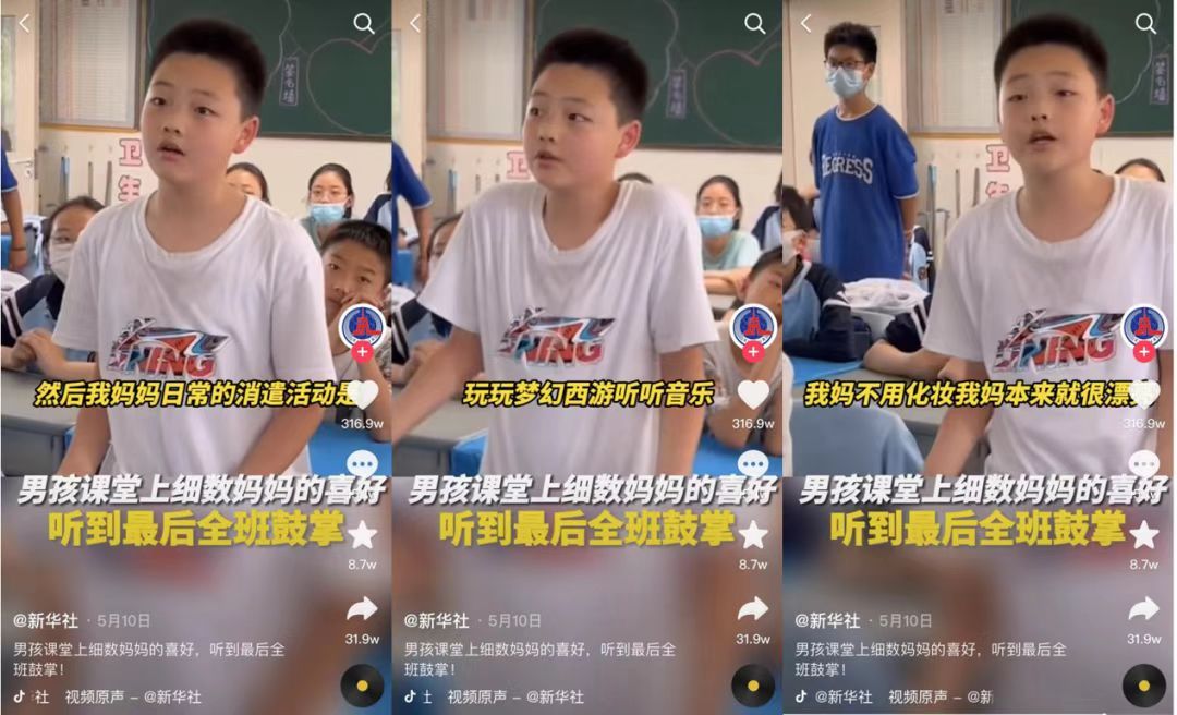 这是有5462万粉丝的新华社抖音官方账号发布的一条视频,点赞破300W。不少网友被男孩眼里的光、语言中的爱意吸引、感动:“孩子从头到尾描述充满自信,要当这样的妈妈!”“最后那句话‘我妈不用化妆,我妈本来就漂亮’让我破防了……”“妈妈是他的骄傲是他的超人。”……