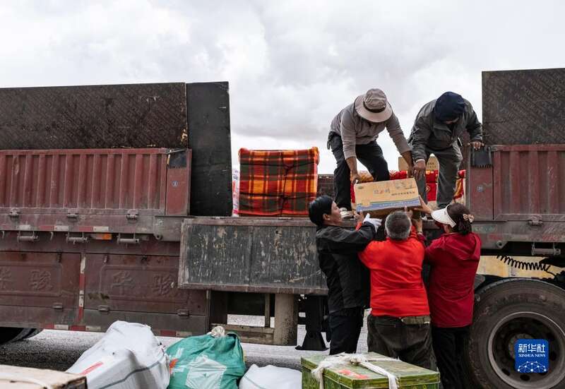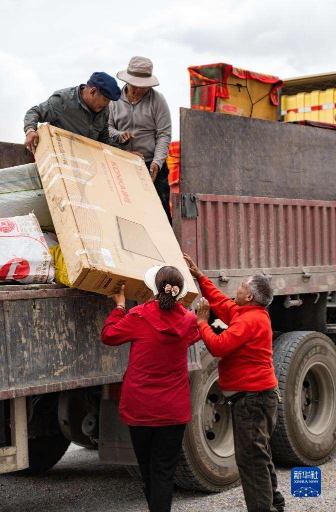 双湖县多玛乡果根擦曲村村民将行李搬上货车(7月12日摄)。