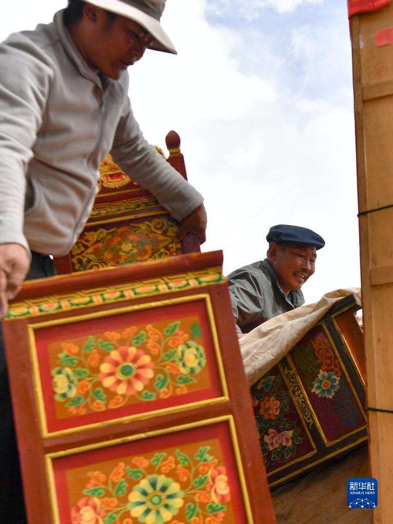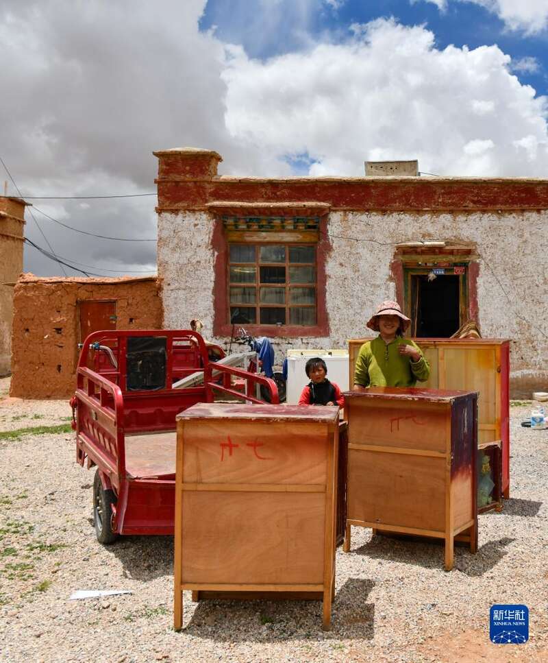 双湖县多玛乡果根擦曲村村民在搬运家具,准备搬迁(7月12日摄)。