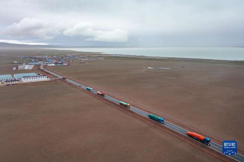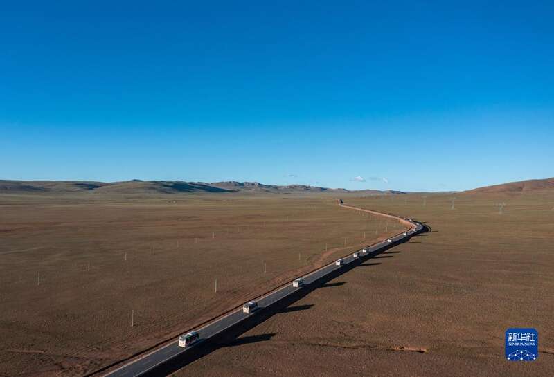 从双湖县出发的车队行驶在前往森布日安置点的道路上(7月19日摄,无人机照片)。