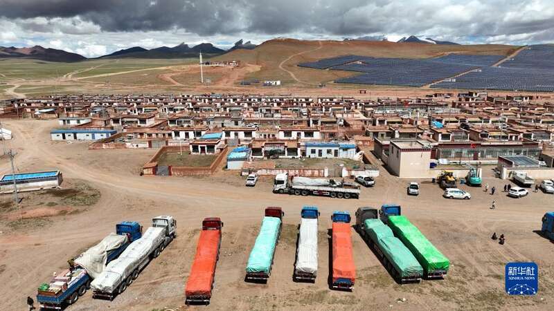 运输家具的货车在双湖县多玛乡果根擦曲村集合(7月12日摄,无人机照片)。