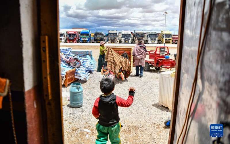 在双湖县多玛乡仲鲁玛村,运输家具的货车整装待发(7月13日摄,无人机照片)。