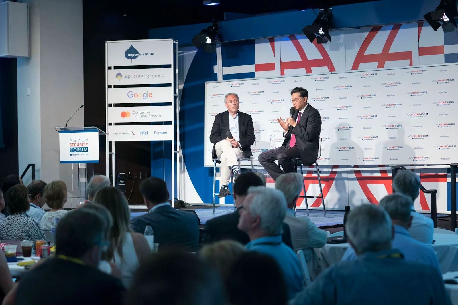 7月20日,秦刚大使在科罗拉多州阿斯彭出席阿斯彭战略安全论坛,与《金融时报》美国版主编卢斯进行专场“炉边谈话”,来自美政府、战略界、智库、外交使团、非政府组织等各界约400多人参加。秦大使在谈话中重点就中美关系、台湾、涉港、涉疆、乌克兰、CPTPP等问题阐述中方政策立场。
