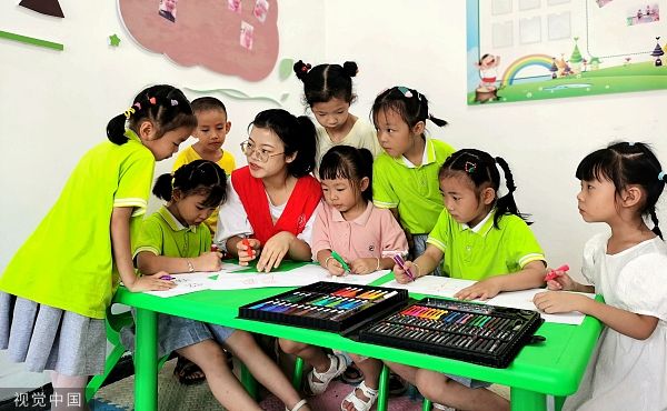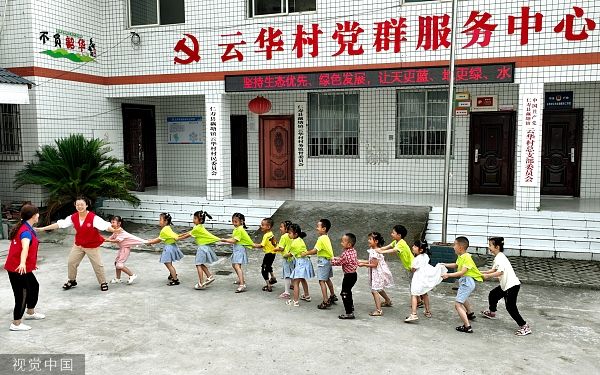 2022年7月20日,四川眉山,仁寿县藕塘镇云华村村委会内,党员志愿者正在和留守儿童一起玩趣味游戏。
