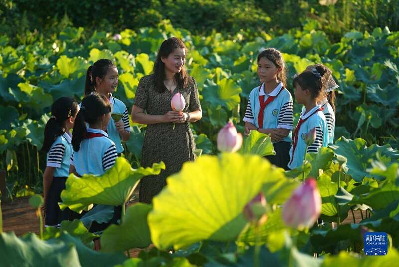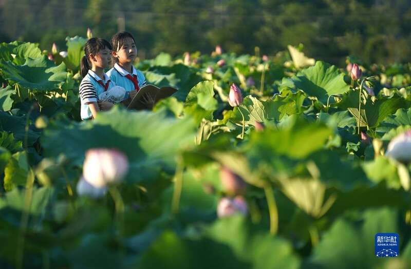 孩子们在江西省武宁县澧溪镇澧溪村的一处荷塘采风(7月10日摄)。