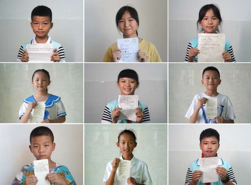 江西省武宁县的孩子们在展示自己创作的童诗(7月10日摄,拼版图片)。