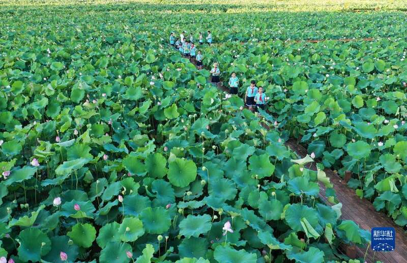孩子们在江西省武宁县澧溪镇澧溪村的一处荷塘采风写诗(7月10日摄,无人机照片)。
