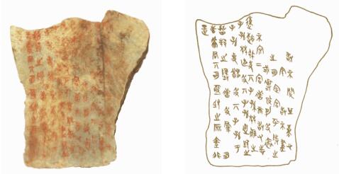 侯马盟书是用毛笔将盟辞书写在玉石片上,辞文多以朱笔书写,少数为墨笔。内容可分为主盟人誓辞、宗盟类、委质类、纳室类和诅咒类等五大类。
