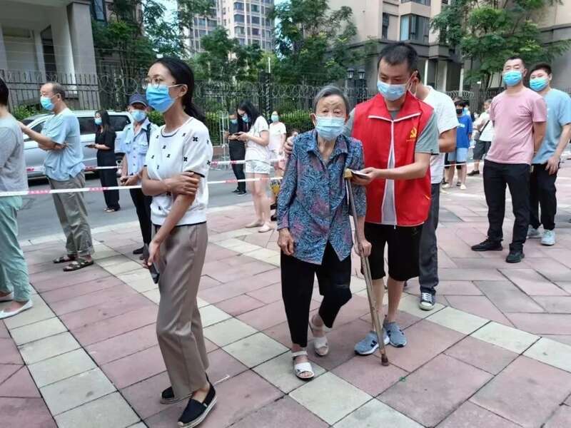 检测任务下发后,跳蹬河街道青年突击队火速集结80余名青年志愿者,支援街道辖区疫情防控工作。天还未亮,突击队的队员们已经集结成队、整装待发。与此同时,双桥子街道青年突击队员鏖战在万晟、三街坊、双林等社区,穿着被汗水浸湿了又干、干了又湿的防护服,从点位搭建到核酸采集指引、再到信息录入,全过程参与。7月18日,成都成华区华康路金科天籁小区外,上百医护人员和青年突击队集结一起,他们穿上防护服进入小区开展核酸采样。对小区有行动不便或者年纪太大的居民,医生和青年突击队员会上门采样。“感谢你们的贴心服务,大家齐心协力,一定能守住家园平安!”看到小区里忙前忙后的 “大白”和青年志愿者,居民纷纷在小区微信群点赞。