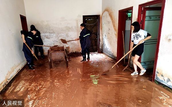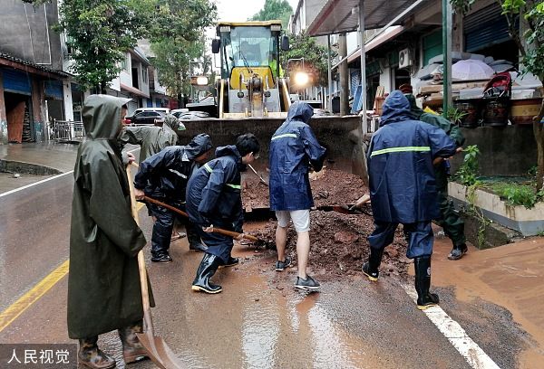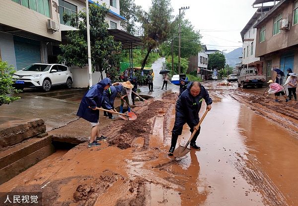 2022年7月22日,四川省巴中市,在通江县诺江镇赤江街道,镇村应急队伍和干部群众一起帮助受灾户清淤、恢复道路通畅等抗灾自救。