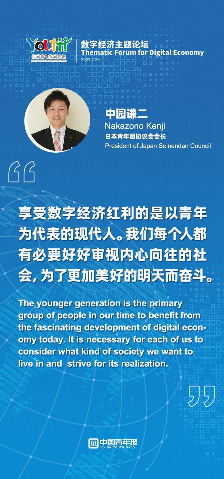 日本青年团协议会会长中园谦二表示,日本青年正在不断利用数字技术进行创新。他说,“享受数字经济红利的是以青年为代表的现代人。我们每个人都有必要好好审视内心向往的社会,为了更加美好的明天而奋斗。”(制图|程璨 文案|赵丽梅)