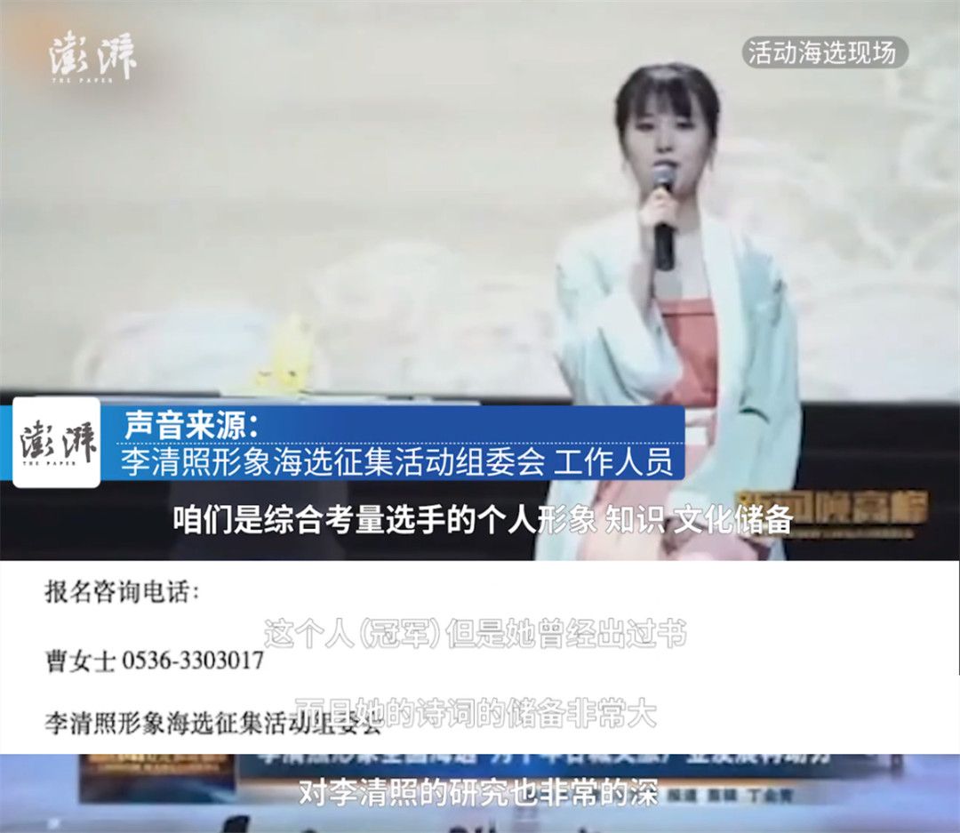 李清照形象海选征集活动组委会工作人员回复澎湃新闻称,咱们是综合考量选手的个人形象、知识和文化储备,在历史上,谁也没见过李清照,只是推断,所以我们指的这个形象并不是具体化的,主要是外在的气质,你不能说李清照就一定是瘦的、是162公分高的,咱们不要这么较真,这么具体化。