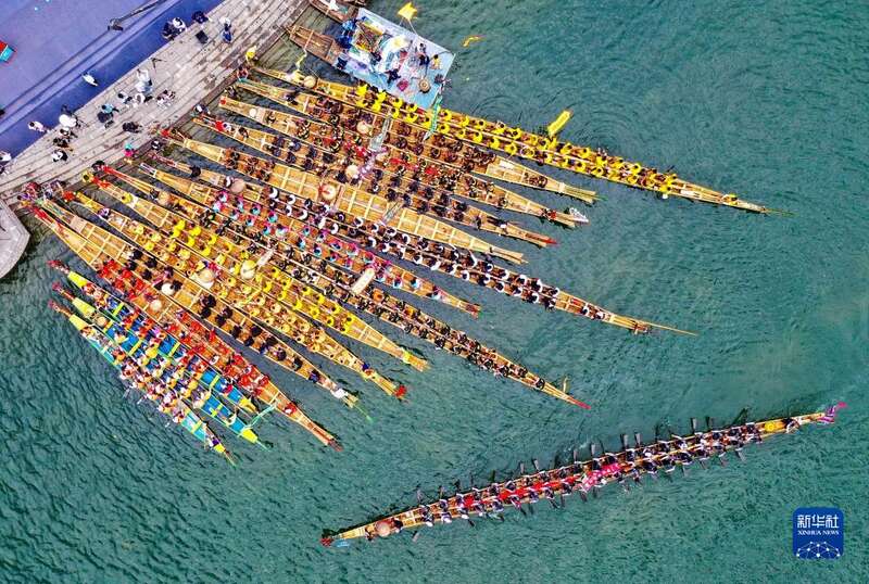 7月22日,参赛龙舟队在贵州省黔东南苗族侗族自治州镇远县 阳河上集结(无人机照片)。