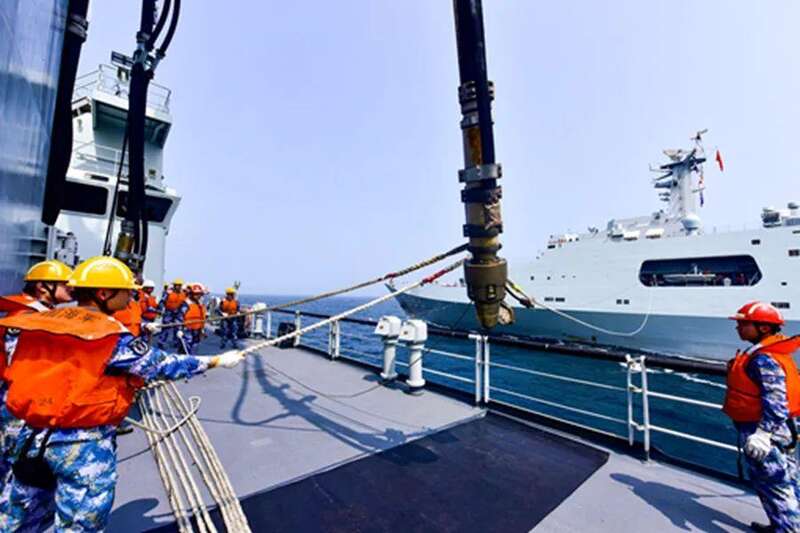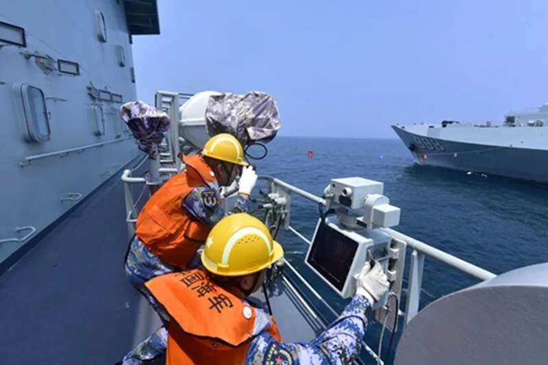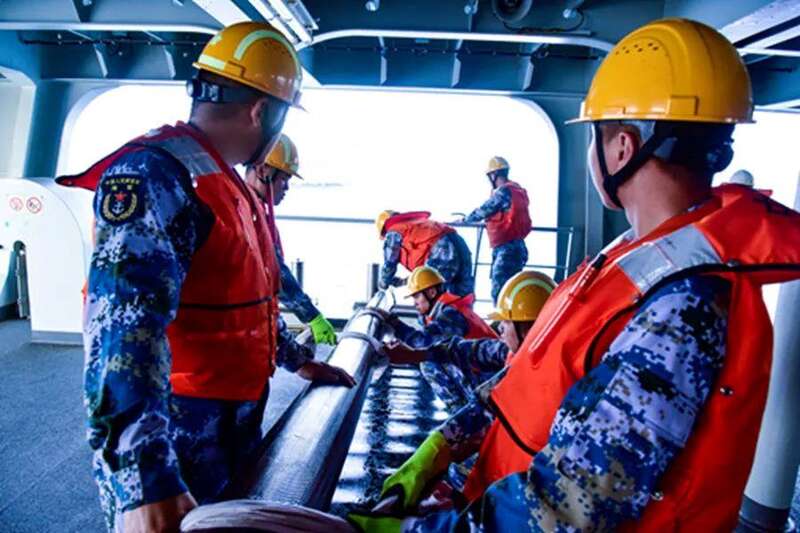 短短20分钟,承载索桥在两舰之间凌空架起,迅速建立补给连接,油管一次对接成功。