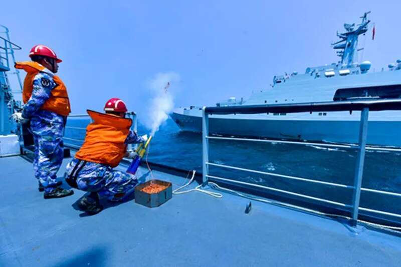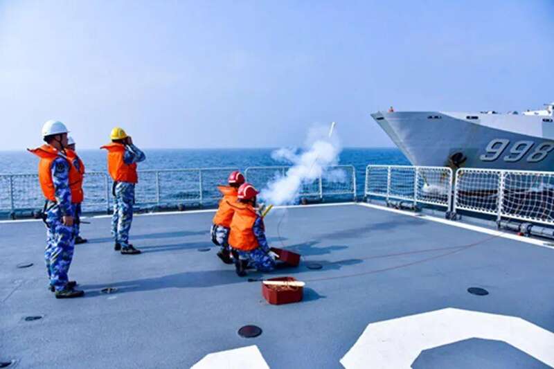战斗一个接着一个。横向补给正在紧张进行,导调组却临时加码,“补给海域突遇强对流天气,前方海区风浪过大,立即转换为纵向补给。”同时,为了模拟逼真战场环境,洪湖舰决定采用恶劣海况下使用的抛投器发射引缆的方式进行纵向补给。