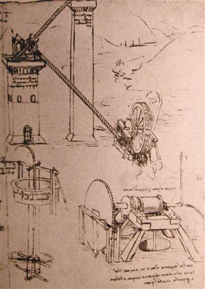 在城市规划方面,达·芬奇构想了一座“乌托邦”式的理想城市。当时欧洲黑死病肆虐,他率先以卫生与美观为出发点,将城市进行功能性分层,具有高架区域和地下区域,并设计了合理的下水道排污体系。在改善河道方面,他为佛罗伦萨与亚诺河的通航作了运河规划。在排涝防洪方面,达·芬奇绘制了一种“离心泵”来制造出海水漩涡,利用虹吸原理将沼泽中的水抽排入漩涡。当时,人们认为这些手稿中的设想不切实际,而如今抽吸泵确实被用于排干沼泽,某些运河航线已经成为重要的交通路线。这些前瞻性的设计具有实用性,达·芬奇的思想远远超越了自己的时代。