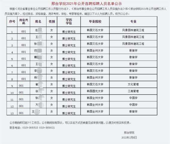 这则《邢台学院2021年公开选聘拟聘人员名单公示》,在邢台市人力资源和社会保障局官网上仍然能查到。公示中称,根据《河北省事业单位公开招聘工作人员暂行办法》《邢台市事业单位公开招聘工作人员实施办法》和《邢台学院2021年公开选聘工作人员实施方案》,经过报名、资格审查、测评考核、体检、考察等程序,确定13名拟聘人员。这13名博士研究生全部为女生,分别毕业于韩国又石大学、韩国全州大学和韩国圆光大学,其中1人为文化管理专业,1人为工商管理专业,2人为中国学专业,3人为风景园林建筑工程专业,6人为教育学专业。