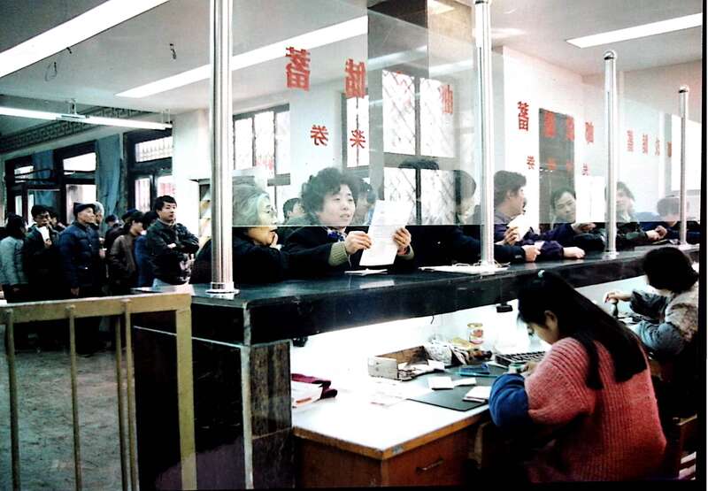 1992年,鲁敏(红毛衣戴护袖者)在南京新街口邮局做营业员。