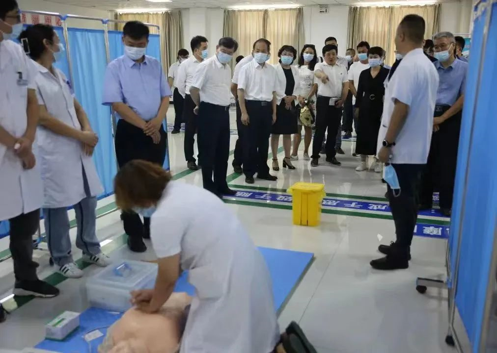 与会人员在吐鲁番市人民医院临床技能培训中心参观基地建设和CPR现场培训情况