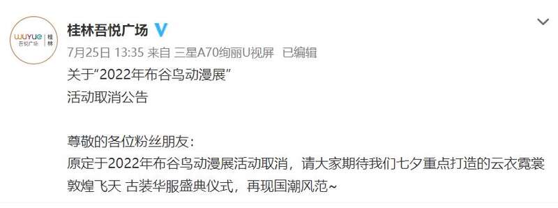 7月25日,桂林吾悦广场官微发布声明,称原定举办的2022年布谷鸟动漫展活动取消。