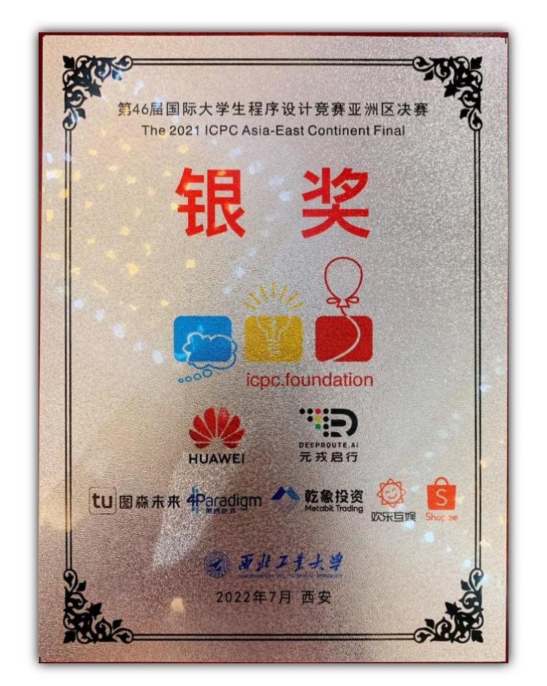 亚洲区决赛,全国160所高校、356支队伍同场竞技,斩获亚洲区决赛银牌,学校排名29,队伍排名55。