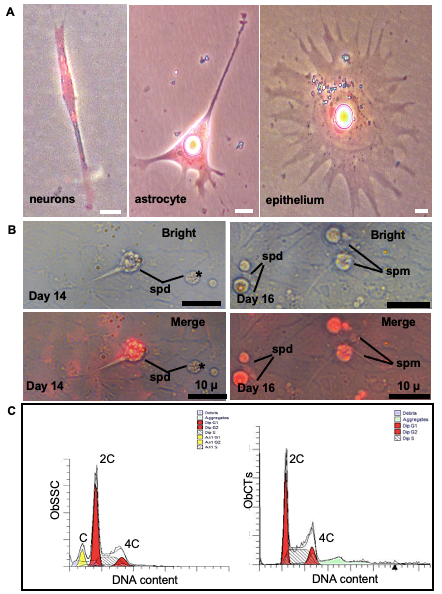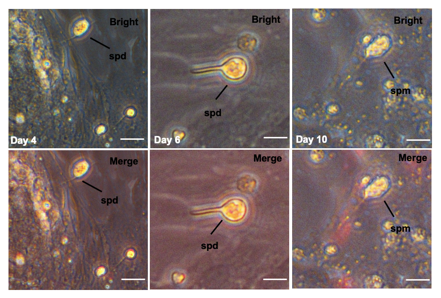 在实验室,马口鱼精原干细胞系与马口鱼精巢细胞共同培养,细胞可以进入并完成减数分裂以产生单倍体产物。到了第14天,在培养基中观察到表达红色荧光蛋白的精子细胞,表明马口鱼精原干细胞系逐渐诱导为未成熟精子细胞。在培养16天后,观察到马口鱼精原干细胞系分化为更成熟的精子,尾部有轻微摆动行为。这表明,在合适的诱导条件下,马口鱼精原干细胞系可以进入精子发生阶段,产生了“神奇”的精子细胞。
