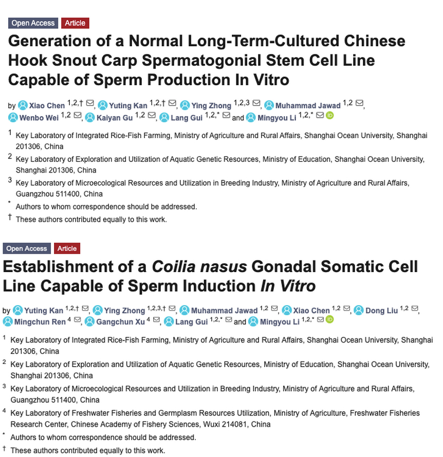 相关研究成果以“Generation of a Normal Long-Term-Cultured Chinese Hook Snout Carp Spermatogonial Stem Cell Line Capable of Sperm Production In Vitro”和“Establishment of a Coilia nasus gonadal somatic cell line capable of sperm induction In Vitro”为题发表于Biology。此次研究由学校陈霄(硕士生)、阚宇婷(硕士生)和仲颖(博士后)等人完成,通信作者为李名友教授和桂朗副教授。此次两项研究得到国家重点研发计划“蓝色粮仓科技创新”重点专项项目(批准号: 2018YFD0901205)和自然基金面上项目(批准号: 31672700)的资助。