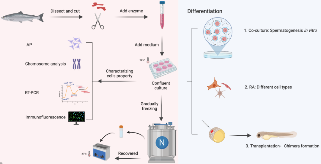 实验人员将马口鱼精原干细胞系移植到斑马鱼胚胎中,观察可以看到它们分化形成来源于三个胚层的不同细胞。此外,还发现马口鱼精原干细胞系可以在斑马鱼性腺定植,并产生精子。